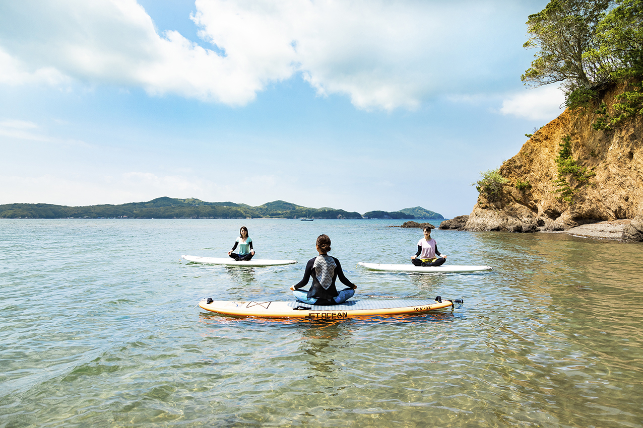 SUPボードの上でポーズをとりヨガを行うことで、水のゆらめき、ここちよい風等、