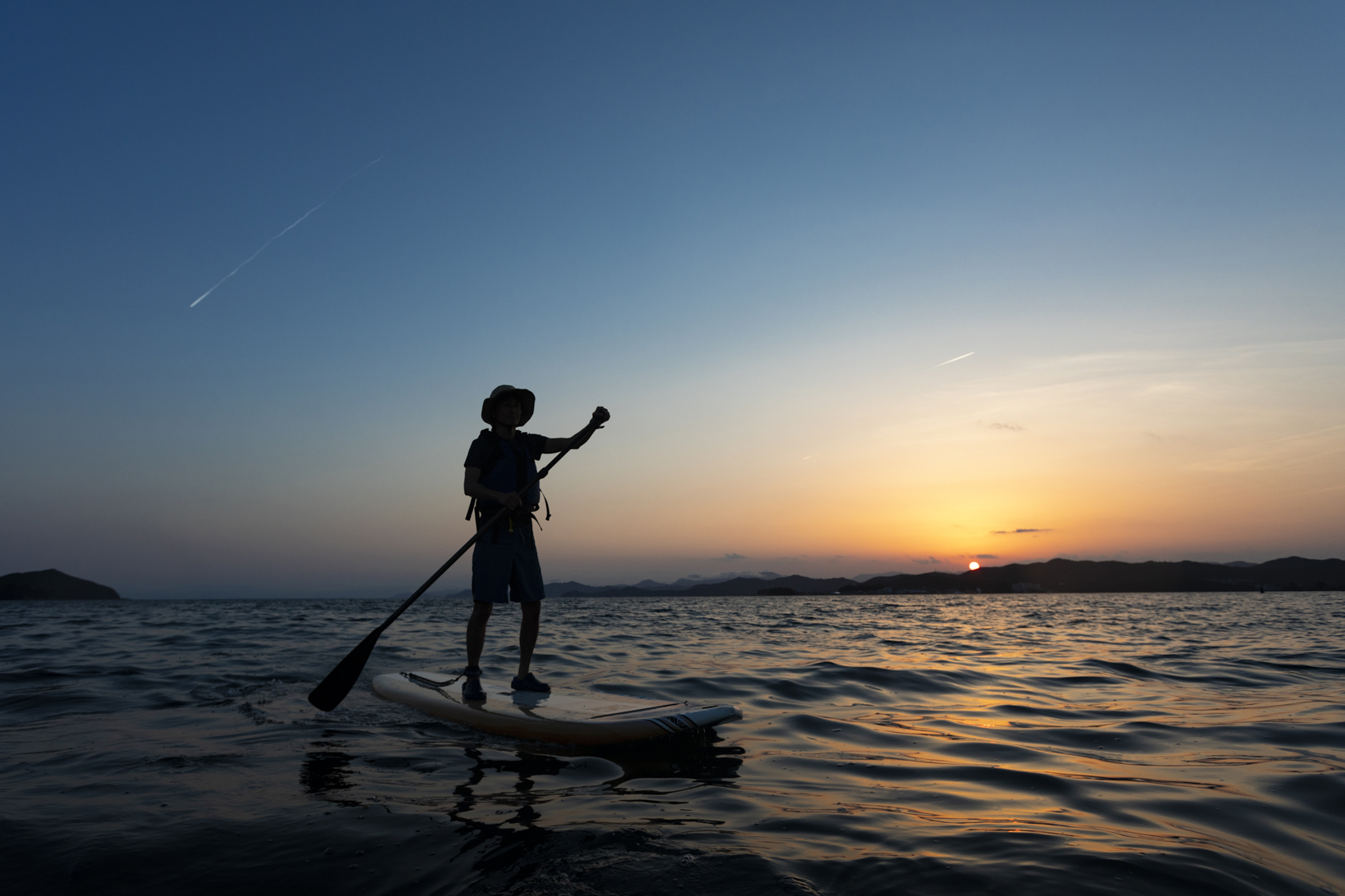 夕日の時間帯にあわせたSUPプログラム。夕陽に染まる海の上、波の音を聴きながら、幻想的な海上散歩をお愉しみいただけます。