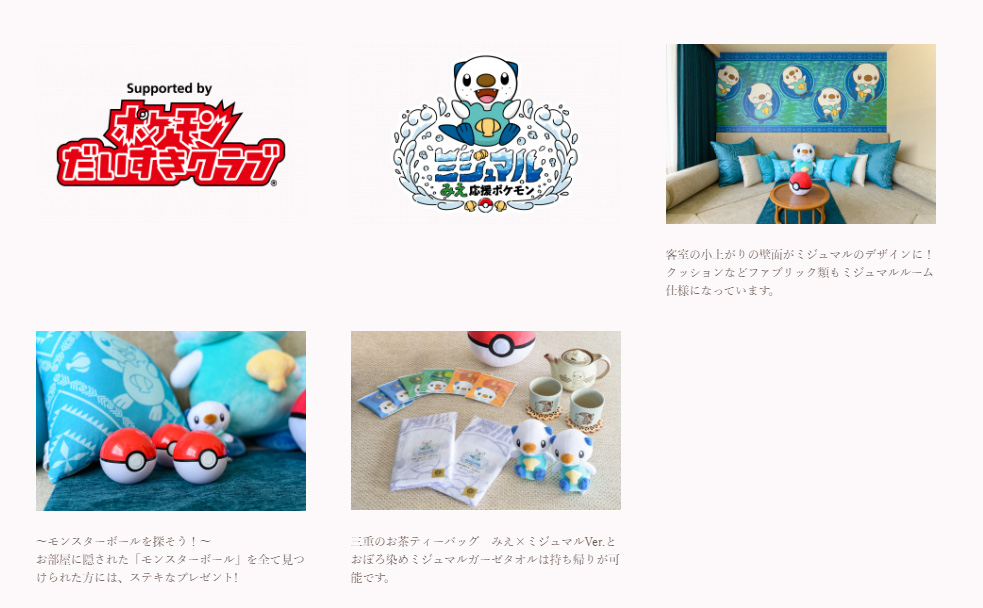 三重県と株式会社ポケモンの包括連携協定に基づく「三重県×ミジュマル」の取組に協力・参画し、みえ応援ポケモン「ミジュマル」とコラボしたコンセプトルーム「ミジュマルルーム」を 1 室限定で販売。